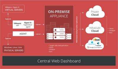 Infrascale Disaster Recovery backs up physical servers and virtual machines to a local appliance before it is replicated to the cloud. The cloud could be a private cloud, Infrascale’s cloud or a popular third party cloud, such as Google Cloud Platform, Amazon AWS, Microsoft Azure or IBM Bluemix.